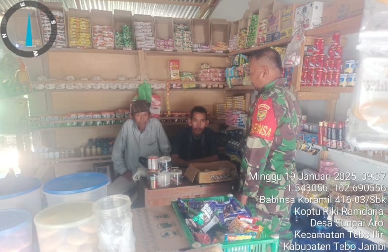 Kodim0416bute.co.id, Tebo – Menjaga stabilitas harga Sembako di warung sekitar, Babinsa Koramil 416-03/Sungai Bengkal Koptu Riki Ramadana melakukan monitoring harga barang kebutuhan pokok, bertempat di Warung Sekitar Desa Sungai Aro Kecamatan Tebo Ilir Kabupaten Tebo, Minggu (19/01/2025).