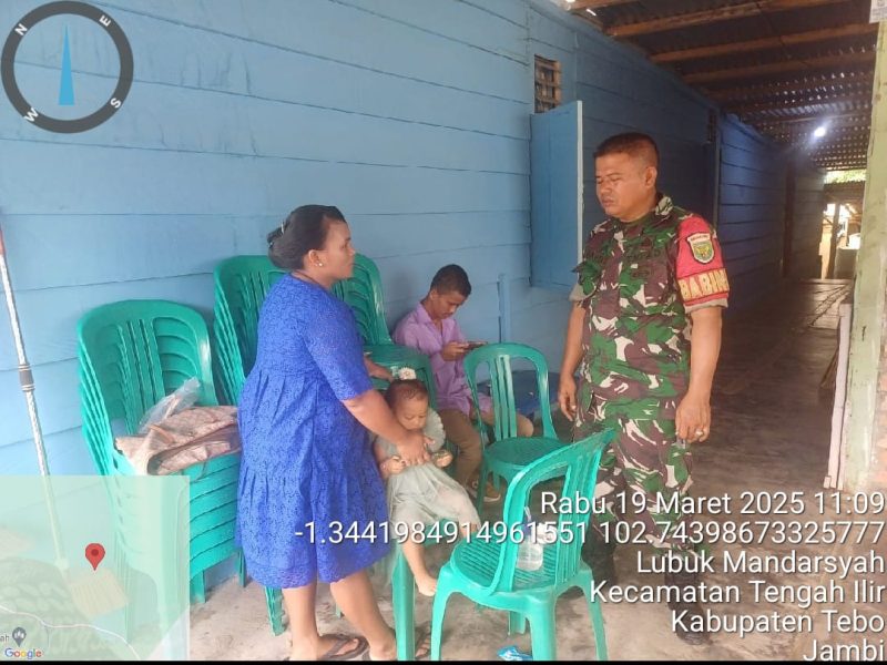 Kodim0416bute.co.id, Tebo – Dalam upaya mempererat hubungan dengan warga dan memastikan kondisi kesehatan anak-anak di wilayah binaannya, Babinsa Koramil 416-05/Muara Tebo, Kodim 0416/Bute, Sertu Hardi melaksanakan komunikasi sosial (Komsos) dengan bersilaturahmi ke rumah-rumah warga di Desa Lubuk Mandarsah, Kecamatan Tengah Ilir, Kabupaten Tebo, Rabu (19/03/2025).