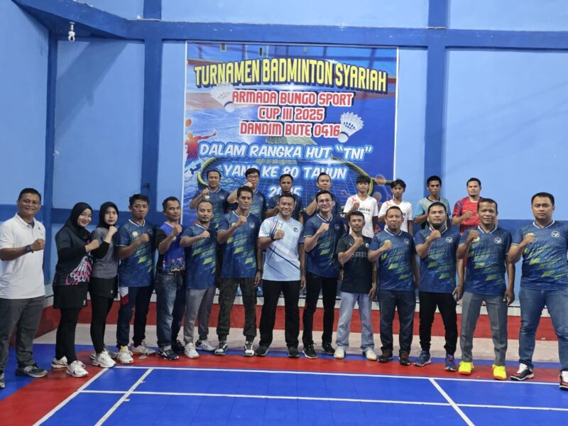 Kodimbute.co.id,Bungo – Dalam rangka memperingati HUT Ke-80 TNI tahun 2025, Kodim 0416/Bute menggelar Turnamen Badminton Syariah yang berlangsung di Hall Armada Bungo Sport, Kelurahan Pasir Putih, Kecamatan Rimbo Tengah, Kabupaten Bungo, Kamis (02/10/2025).