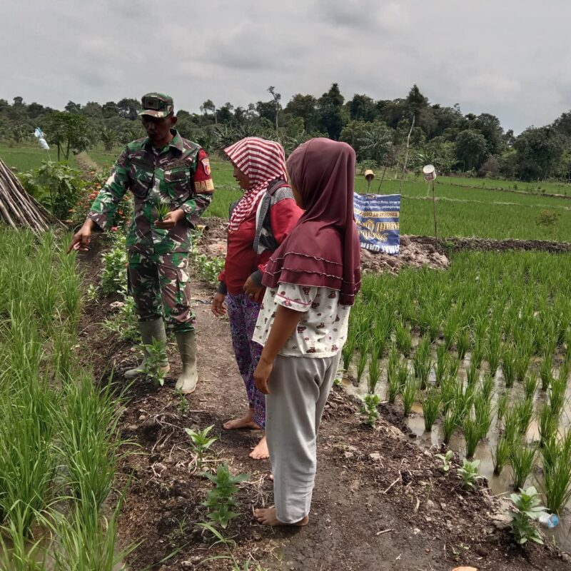 Babinsa turun langsung ke lapangan untuk memantau perkembangan tanaman serta memberikan motivasi kepada para petani agar terus meningkatkan hasil panen.