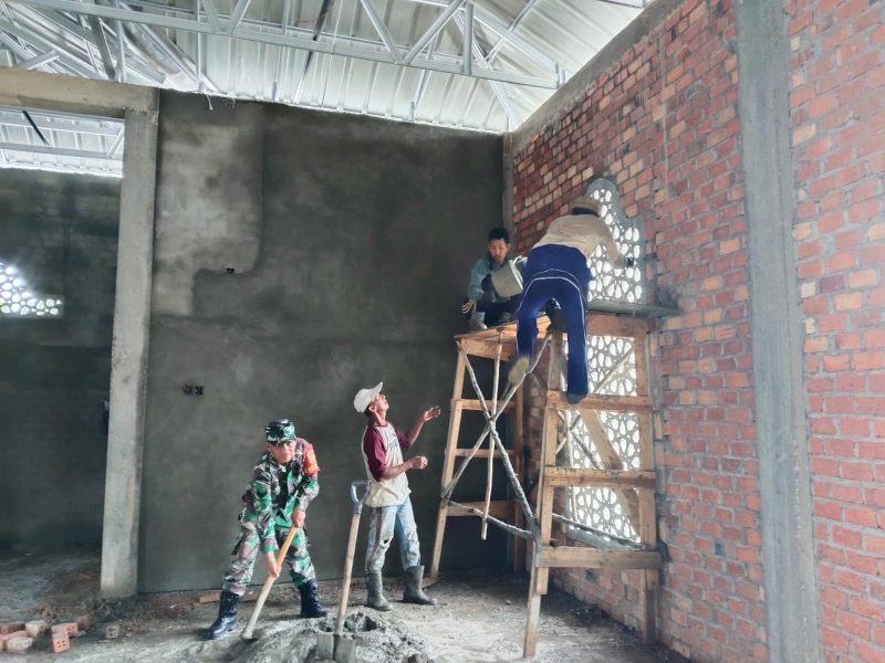 Kodimbute.co.id,Tebo — Babinsa Koramil 416-03/Sungai Bengkal, Sertu Umbar Suharmanto, menunjukkan kepeduliannya kepada masyarakat dengan turut serta membantu proses plester tembok Masjid di Desa Betung Bandara Barat, Kecamatan Tebo Ilir, Kabupaten Tebo.Minggu (06/07/2025).